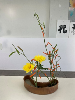 私の作品(花材:菊・唐辛子オレンジ)/講評