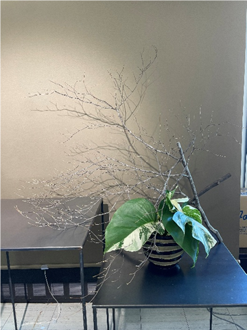 私の作品①(花材:モンステラ)|面のボリュームと木の構成のバランス