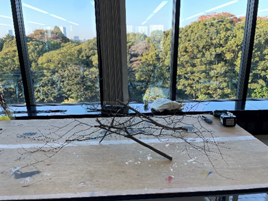 木の構成の上に花材を組み合わせて作品を作る段階に入り、