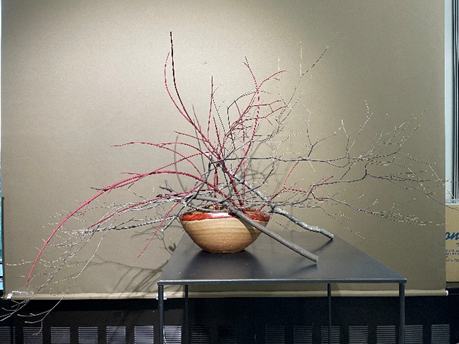 木の構成は、草月流の中でも特に“線の扱い”と“空間の捉え方”が試される技法で、枝の疎密・強弱・角度のつけ方など、構成力そのものが問われる奥深いテーマです。